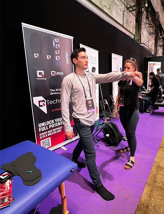 We show first, we sell second. The 2-minute flash demo (120s, typically using Q-Go) proves an observable effect on functional strength and balance — the ideal tool to convince an audience in seconds. For example, in one reported demonstration, Kirk Côté (Summit Media) described an immediate improvement in shoulder discomfort after application — a reported observation illustrating the instant “wow” our demos can create.